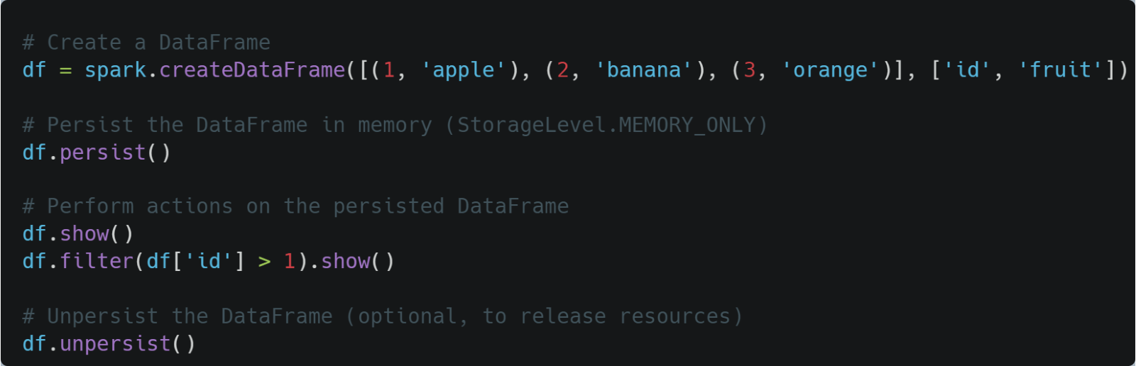 이 예시에서는 persist() 메소드를 사용하여 DataFrame을 메모리에 캐시합니다. DataFrame에 대한 후속 작업은 캐시된 데이터의 이점을 누릴 수 있어 성능이 개선됩니다. 특정 사용 사례와 사용 가능한 리소스를 기반으로 적절한 저장 수준을 선택해야 한다는 점을 기억하세요.