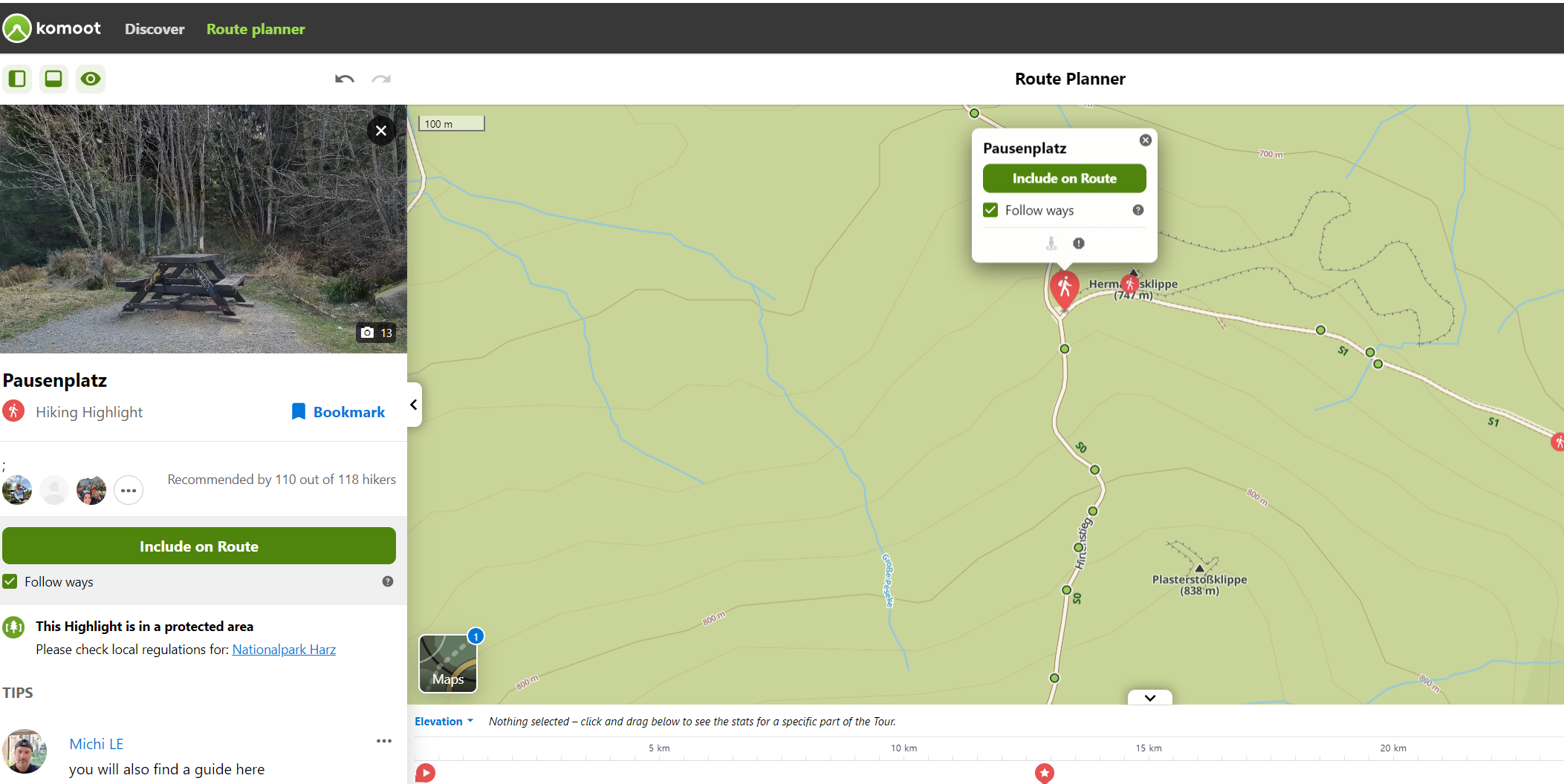 이미 추가한걸 왼쪽 목록이나 지도에서 삭제도 쉽게 가능합니다. 선택한 경유지의 순서대로 최적의 경로를 자동으로 만들어주고 지도에서 바로 확인이 가능합니다. 제가 설정한 최종 코스는 위와 같습니다. 총 27.9km의 약 8시간 40분 정도 걸리는 코스이네요. 지금 계절은 독일의 낮이 길어져서 하루 코스로 다녀오기도 적당할거라 생각합니다. 물론 초보자에게 추천하는 코스는 아닙니다.