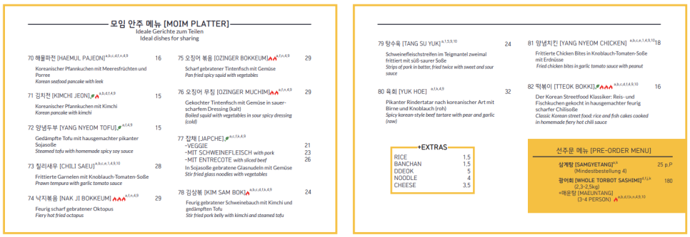 그중에서도 이번에 소개해 드릴 맛집은 바로 모임(Mo:im)이라는 한식당입니다. 모임은 구 한옥 위치에 리모델링을 해 오픈한 한식당입니다. 이전과 같은 사장님은 아니고요 새로우신 분이 가게를 여셨어요. 한식당 모임은 맛뿐만이 아니라 베를린스럽지 않게 레스토랑의 인테리어가 깔끔하게 되어 있기에 외국 친구들을 데려가기도 좋은 장소입니다. 그렇게 소문난 맛집이라 그런지 주말 저녁의 경우 예약을 하지 않으면 자리를 찾기 어려울 정도로 인기가 많은 식당입니다. 유럽에서 한식당들을 보시면 대부분 느끼시겠지만 메뉴 구성은 생각하고 있는 그것에서 벗어나지 않습니다. 네, 생각하시는 메뉴들은 대부분 있어요. 비빔밥부터 불고기, 제육볶음, 양념치킨 등등이요. 미리 주문을 하시면 조금 비싼 가격이긴 하지만 광어회도 맛보실 수 있습니다.