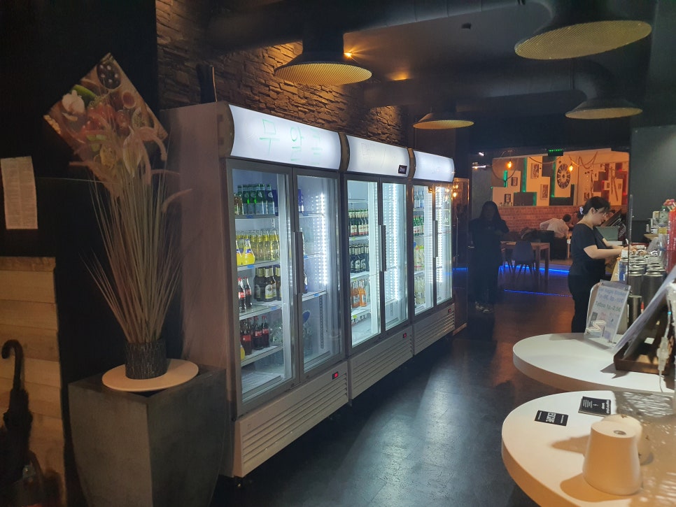 아지트의 가장 큰 특징은 술을 따로 주문하는 방식이 아닌 각자 테이블에서 알아서 냉장고에서 꺼내가 마시는 겁니다. 이렇게 큰 냉장고가 입구 옆에 들어서 있고요 음료부터 다양한 주류가 냉장고에 차 있습니다. 소주도 여러 종류들이 다 있어요. 최근 많은 인기를 끌고 있는 새로 소주도 있더군요. 또한 독일에서 만들고 있는 하루 소주를 맛보실 수도 있습니다. 한국과 독일에서 양조를 배우신 분이 독일에서 소주를 만들고 있어요. 이번에 온라인으로 주문도 해놨는데 배송을 받으면 이건 따로 리뷰를 해보겠습니다.