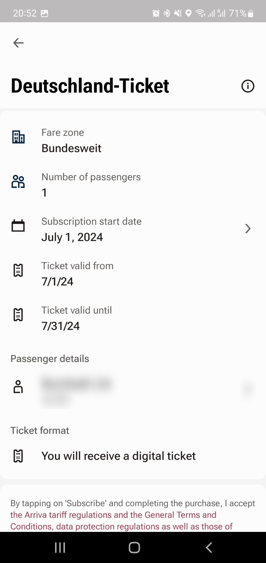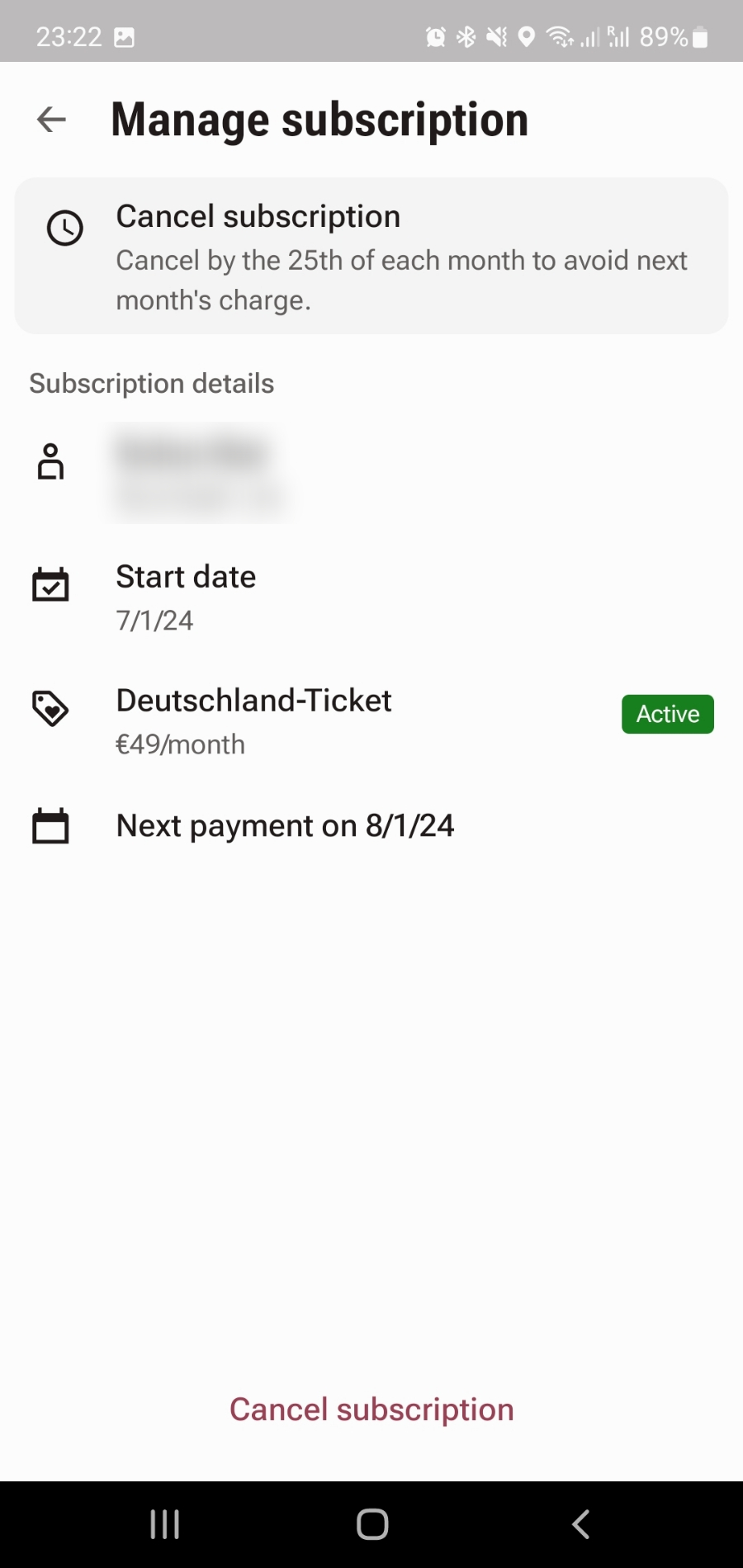 화면 하단에 Cancle subscription 버튼을 누르면 현재 구독하신 도이칠란드 티켓을 취소하실 수 있습니다.
