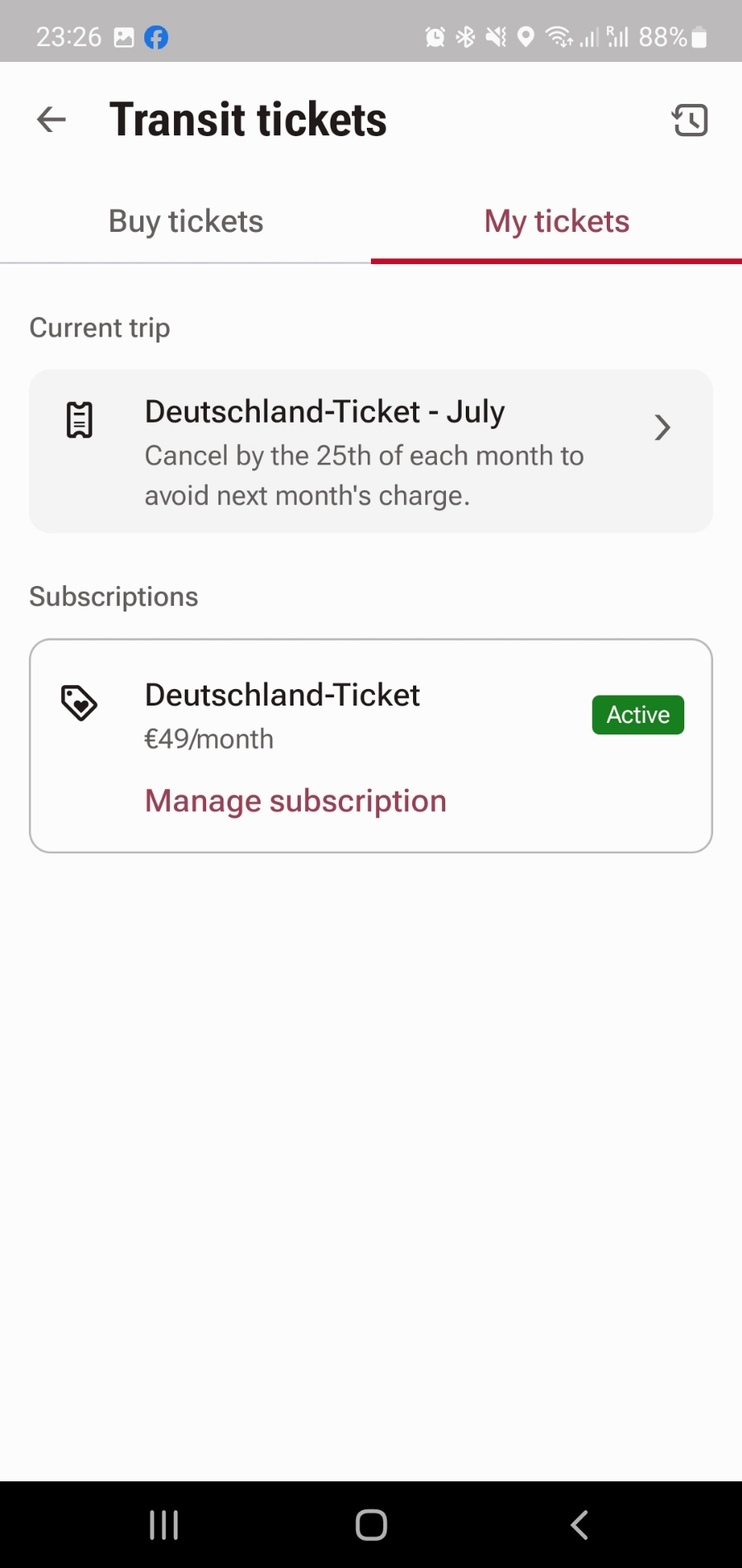 화면 하단에 Cancle subscription 버튼을 누르면 현재 구독하신 도이칠란드 티켓을 취소하실 수 있습니다.
