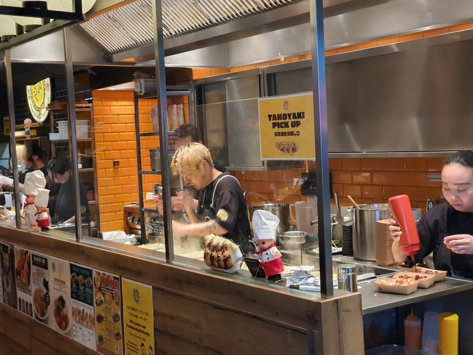 테파치는 리틀도쿄에서도 가장 유명한 타쿠미 라멘집과 곤타 돈카츠 전문점 사이에 위치하고 있으며 이 곳도 다른 식당들과 더불어 길게 줄이 늘어서 있습니다. 타코야키를 전문으로 하는 곳이므로 포장 주문으로 가져가는 사람들도 많습니다. 포장 주문과 식당에서 먹는 줄이 따로 있으므로 잘 보고 줄을 서셔야 합니다.