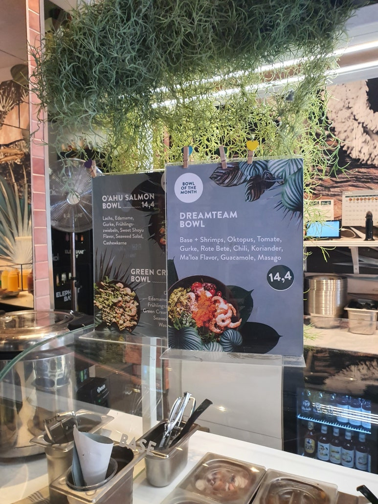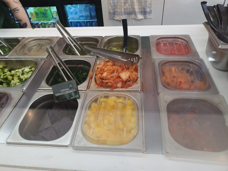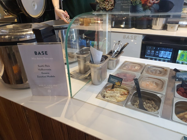 우선 베이스가 될 밥 종류를 골라야 해요. 밥 종류로는 흰 쌀밥(Sushi reis)과 현미밥(Vollkorn reis)가 있어요. 밥 종류가 싫으시다면 호박을 잘게 채썰은 것(Zucchini Nudeln) 아니면 콩(Greens)을 선택하실 수도 있어요.
