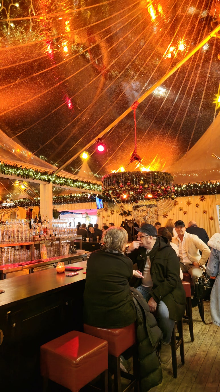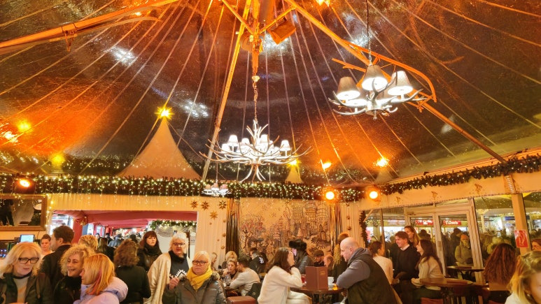 입구를 지나 안으로 들어가면, 크리스마스 조명과 화려한 장식들로 가득한 마켓이 반겨줍니다. 따뜻한 분위기와 다양한 부스들 덕분에 겨울밤이 더욱 특별하게 느껴졌어요. 특히, 마켓 한편에는 멋진 레스토랑 공간도 마련되어 있는데요, 분위기가 정말 훌륭합니다. 🎄✨