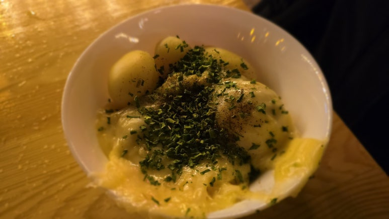 라끌렛의 풍미가 감자의 포근한 식감과 완벽하게 어우러져 한입 한입 먹을 때마다 행복한 미소가 지어졌습니다. 이 맛있는 요리는 크리스마스 마켓의 추운 날씨 속에서도 마음까지 따뜻하게 만들어주는 특별한 간식이었어요.