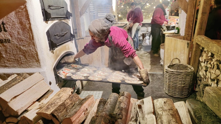 빵을 굽는 상점에서는 불 앞에서 바로 구워낸 빵을 제공합니다. 🥖 이곳의 빵은 겉은 바삭하고 속은 따뜻하고 부드러워, 마켓의 추운 날씨 속에서 손을 따뜻하게 녹이며 즐기기에 제격이에요. 향긋한 빵 냄새가 마켓을 돌아다닐 때마다 발길을 붙잡곤 했습니다.