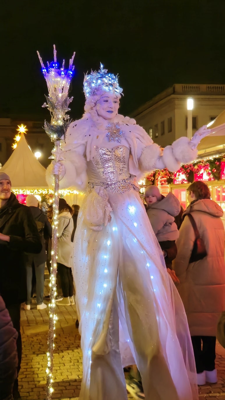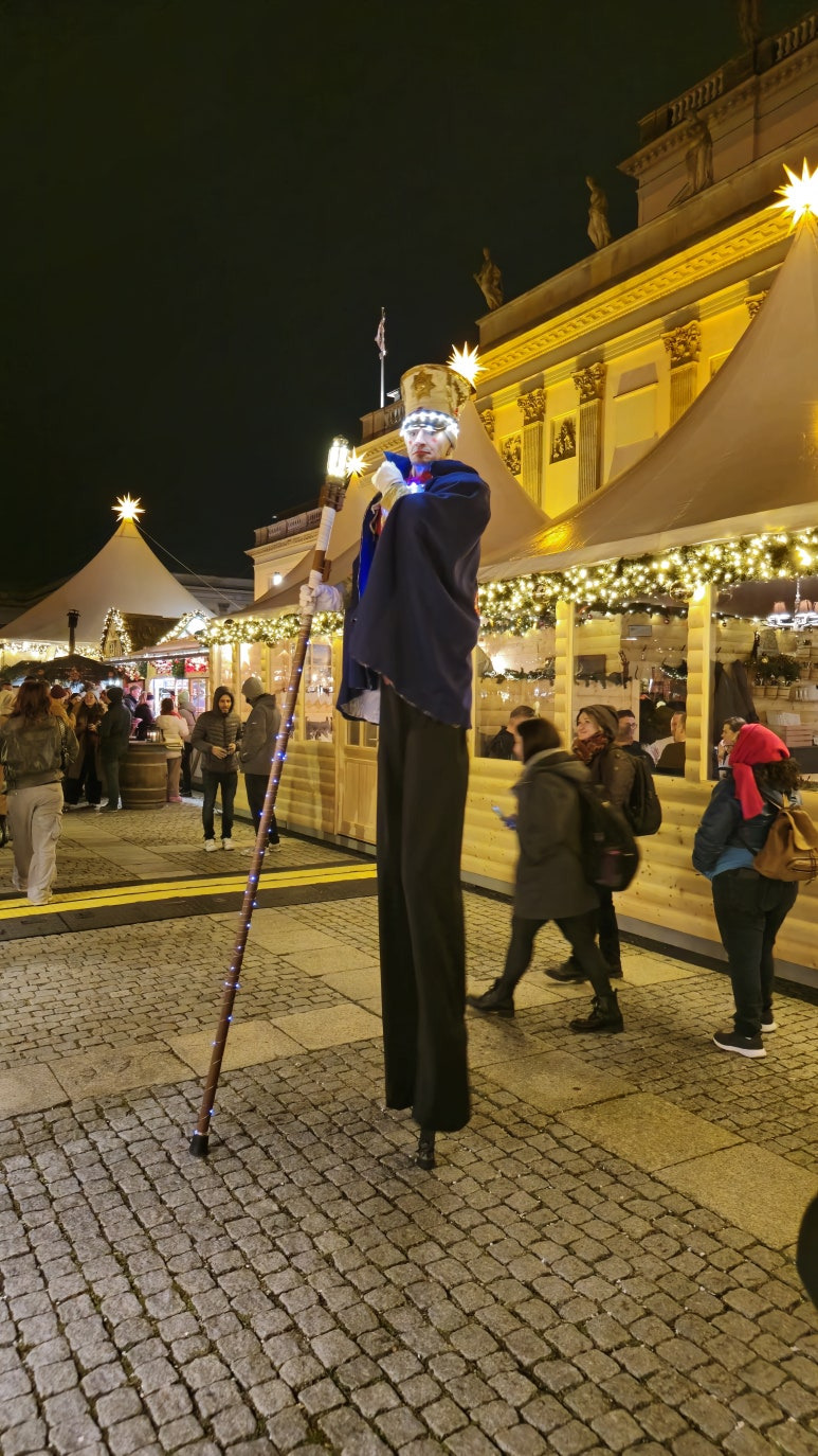 Gendarmenmarkt 크리스마스 마켓을 특별하게 만드는 요소 중 하나는 마켓 곳곳에서 만날 수 있는 장대 다리 분장을 한 퍼포머들이에요. 🎭✨ 이들은 화려한 복장을 하고 마켓 사이를 자유롭게 돌아다니며 방문객들에게 색다른 즐거움을 선사합니다.
