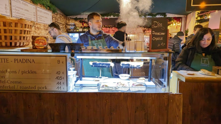 라끌렛의 풍미가 감자의 포근한 식감과 완벽하게 어우러져 한입 한입 먹을 때마다 행복한 미소가 지어졌습니다. 이 맛있는 요리는 크리스마스 마켓의 추운 날씨 속에서도 마음까지 따뜻하게 만들어주는 특별한 간식이었어요.
