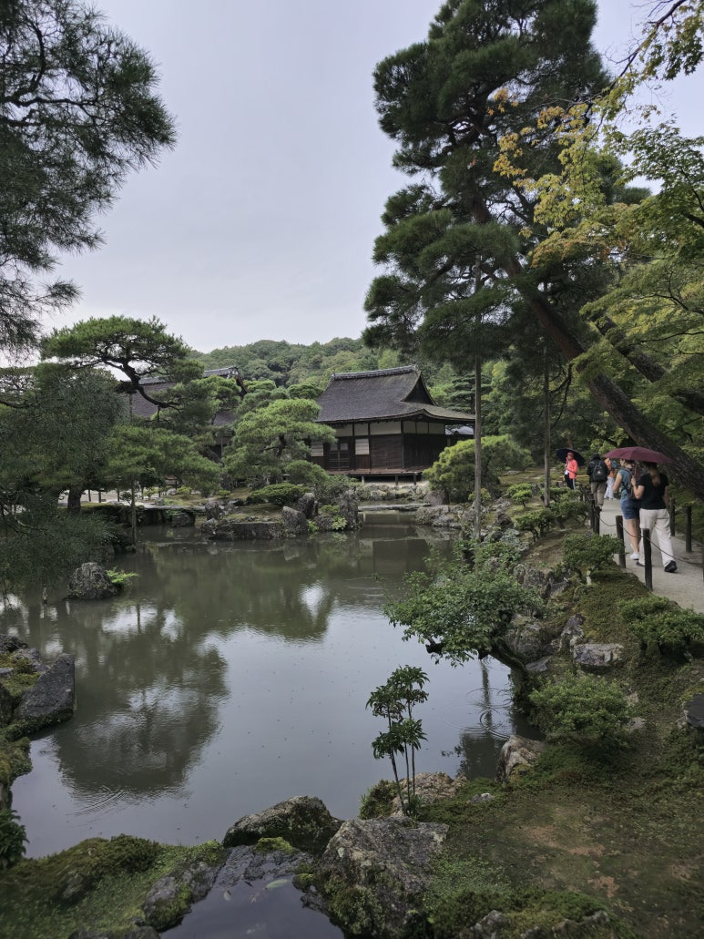 정원을 돌아 작은 연못과 다리를 만나게 됩니다. 이 곳에서 물에 비치는 은각사의 아름다운 모습을 담으실 수 있어요. 날씨가 좋진 않았지만 그덕분에 붐비지 않고 여유롭게 사진을 찍을 수도 있었어요.