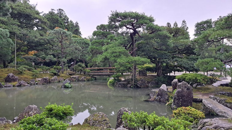 정원을 돌아 작은 연못과 다리를 만나게 됩니다. 이 곳에서 물에 비치는 은각사의 아름다운 모습을 담으실 수 있어요. 날씨가 좋진 않았지만 그덕분에 붐비지 않고 여유롭게 사진을 찍을 수도 있었어요.