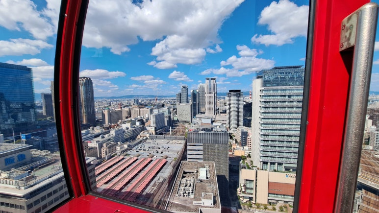 오사카 우메다의 헵파이브(HEP FIVE) 쇼핑몰에서 대관람차를 타기 위해 엘리베이터를 타고 탑승장까지 한 번에 올라갔습니다. 빨간 철골 구조물이 멋지게 장식된 탑승장은 시선을 사로잡았고, 평일 오전이라 그런지 한산한 분위기 속에서 여유롭게 대관람차에 오를 수 있었습니다. 저녁 노을이 질 무렵이면 아름다운 석양과 함께 오사카 야경을 보려는 사람들로 긴 대기줄이 생길 것 같았습니다. 헵파이브 대관람차는 낮에는 오사카 도심의 활기찬 풍경을, 저녁에는 로맨틱한 노을과 야경을 선사해 언제 방문해도 특별한 경험을 제공합니다. 오사카 여행 중이라면 헵파이브에서 시간대별로 색다른 오사카의 매력을 즐겨 보세요!