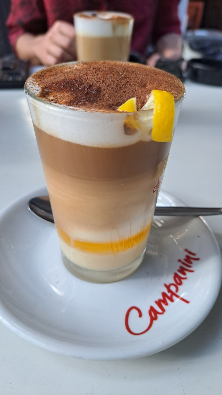 많이 걷다 보니 잠시 카페에서 쉬어 가기로 했습니다. 테네리페에 오면 꼭 마셔봐야 할 커피가 있는데, 바로 '바라키토(Barraquito)'예요. 바라키토는 커피에 달콤한 연유와 리쿼 43(Licor 43)을 넣어 층층이 쌓은 독특한 커피입니다.