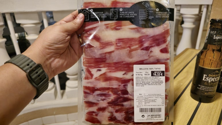 그리고 스페인 하면 하몽을 빼놓을 수가 없지요. 하몽 중에서도 도토리를 먹여 키운 이베리코 품종의 하몽이 정말 유명하지요. 이베리코 돼지고기의 기름의 고소한 맛이 정말 뛰어나요. 그런 하몽을 슈퍼마켓에서 쉽게 구하실 수가 있답니다. 그자리에서 바로 썰어서 포장을 해줘요.