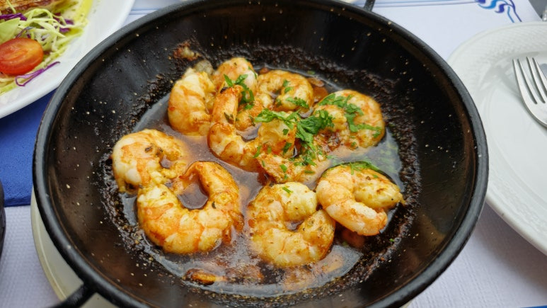 금강산도 식후경! 하이킹도 하고 해서 배가 고팠기에 우선 밥부터 먹기로 했지요. 가까운 곳에 해산물 전문 레스토랑이 있기에 들어가 보기로 했었지요. 주문을 하려던 문어 요리가 지금 안된다고 해버려서 실망하고 급하게 바꿔 감바스를 시켜봤어요. 스페인에서 실패할 일이 잘 없는 요리라 시켰지요. 그런데 이 결정이 정말 잘했다고 생각이 들었었어요. 진짜 역대급으로 맛있는 감바스였어요. 올리브유가 너무 맛있어서 자꾸 빵을 찍어 먹게 만들었지요.