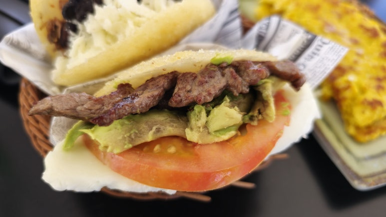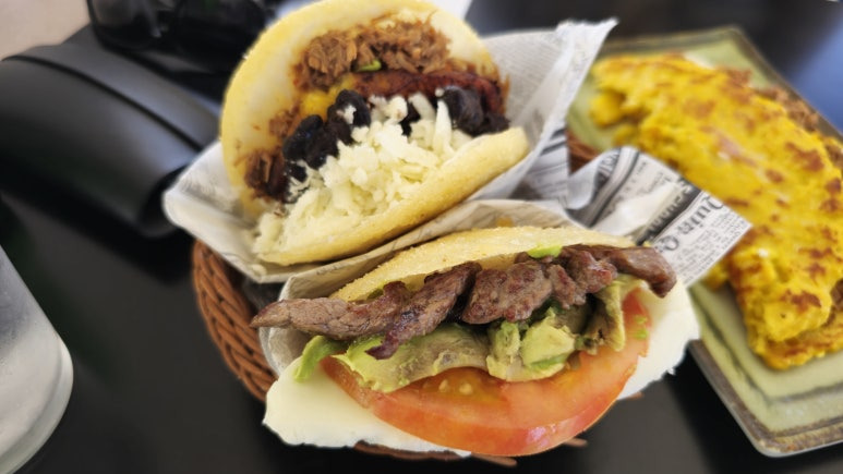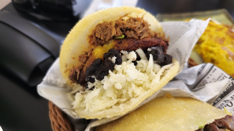 베네수엘라 음식인 아레파스는 옥수수 반죽으로 만든 납작한 빵에 다양한 재료를 넣어 먹는 음식인데, 이곳에서는 고기와 치즈를 듬뿍 넣은 풍성한 메뉴로 즐길 수 있었습니다.