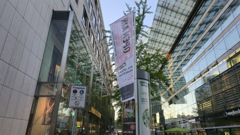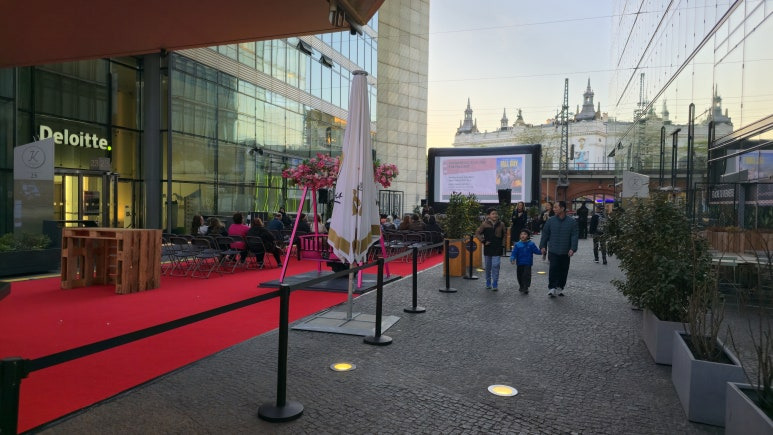 크란츨러 에크(Kranzler Eck)는 쿠담(Ku'damm) 거리 바로 옆에 위치한 베를린의 인기 명소로, 평소에도 다양한 문화 행사로 활기를 띠는 곳입니다. 이번 야외 영화 상영(Open Air Kino) 기간 동안 대형 스크린이 설치되어, 매일 저녁 다양한 장르의 영화가 상영됩니다.