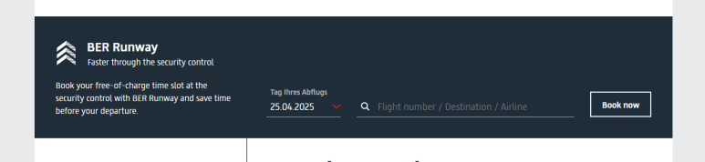 You can book a time slot within which you can use the BER Runway entrance to security control 4 via our website, our BER App or the smartdepart app. We expect the waiting time to the start of the security control to be around 5 to 10 minutes thanks to t