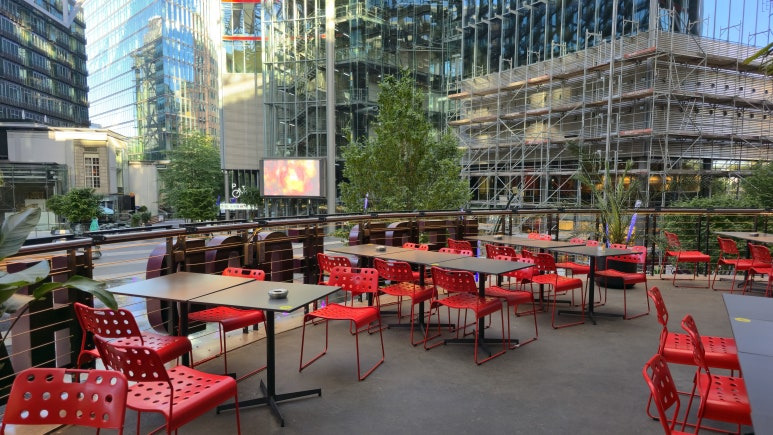 KERB Food Hall의 2층에는 작은 발코니 공간이 있어요. 이곳에서는 Der Center 광장을 내려다보며 식사를 즐길 수 있는 테이블이 마련되어 있습니다.