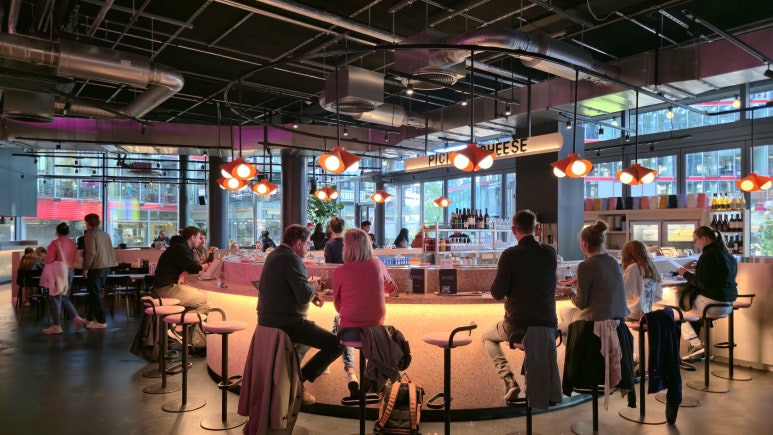 포츠다머 플라츠에는 이미 대형 푸드코트 Manifesto Market이 자리 잡고 있습니다. 이에 비해 KERB는 규모는 작지만, 훨씬 모던하고 세련된 인테리어와 독립된 브랜드 콘셉트로 차별화를 꾀하고 있습니다.