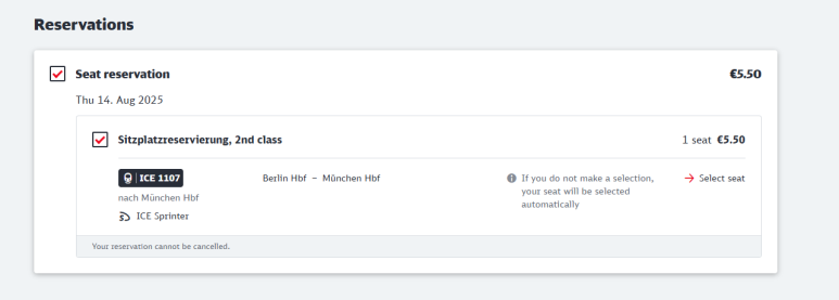 - 좌석 지정을 원하면 추가 요금(5.50유로)을 내고 선택 가능