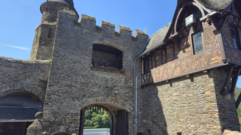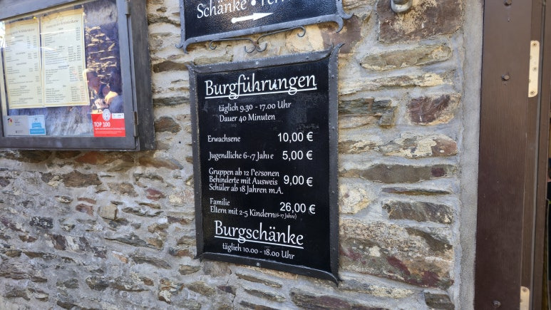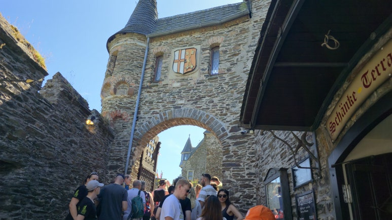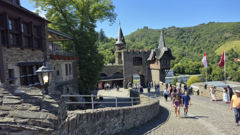 코헴성은 유명한 관광지이기에 성 입구부터 많은 사람들이 있었습니다. 성 내부는 가이드 투어로만 입장이 가능해서 투어를 기다리는 사람들이 입구앞에 몰려 있었어요. 입장료는 성인 10유로, 만 6세에서 17세까지는 5유로입니다. 가이드 투어를 기다리는 곳 바로 옆 기념품 상점에서 티켓도 판매하고 있었습니다. 내부 자체가 유명한 곳은 아니기에 내부 투어가 필수는 아닙니다. 기념품 상점을 통과해 지나가면 레스토랑이 있는데 이 레스토랑의 뷰가 매우 멋집니다. 코헴과 모젤강의 경치를 바라보며 커피 한 잔도 꽤 운치가 있습니다.