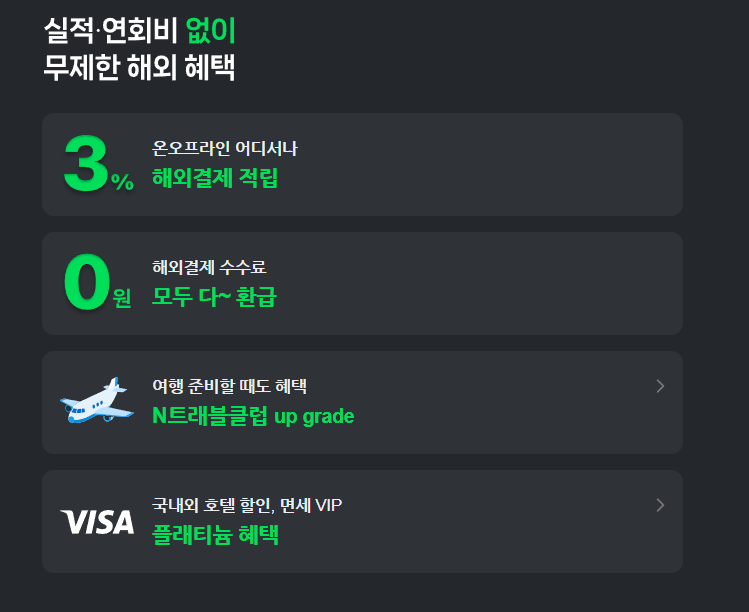 네이버 페이 머니카드는 연회비 없이 전월 실적 조건도 무관하게 해외 결제 시 무려 3%를 포인트로 적립해 주는 파격적인 혜택으로 큰 인기를 끌었습니다.