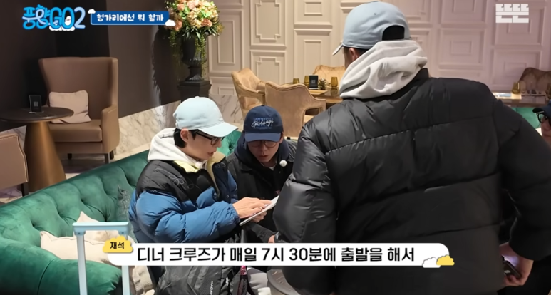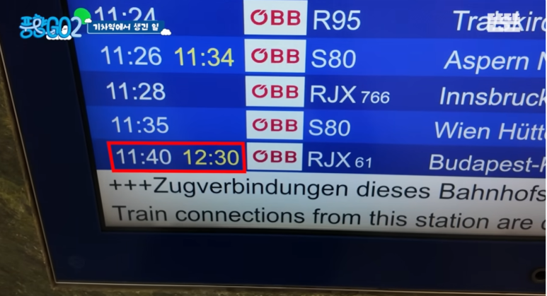 즐겁게 간식을 먹고 플랫폼으로 향한 멤버들. 하지만 전광판에는 청천벽력 같은 소식이 떠 있었습니다. 공사 여파로 인해 11시 40분 열차가 50분이나 지연되어 12시 30분에나 도착한다는 안내였죠.