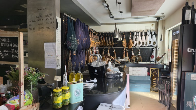 이번 여행 중 가장 인상 깊었던 곳은 바로 'Restaurante Flores Gourmet'였어요. 이곳은 정육점처럼 하몽을 팔기도 하지만, 안쪽에서 갓 썰어낸 신선한 하몽과 와인을 즐길 수 있는 곳이에요.