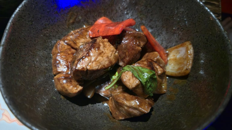 - Spicy Argentinian Beef Filet Cubes (매운 아르헨티나산 소고기 요리): 큐브 모양으로 썬 아르헨티나산 소고기 안심을 적양파, 페페로니와 함께 후추 소스로 볶아냈습니다.