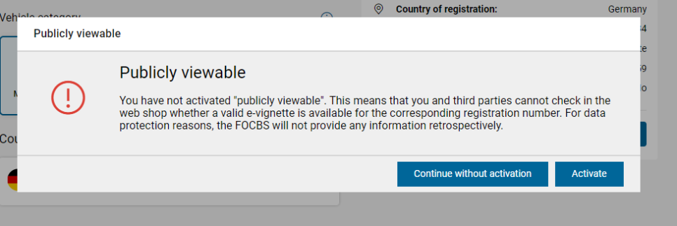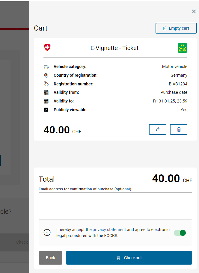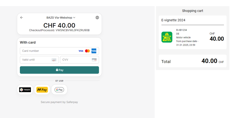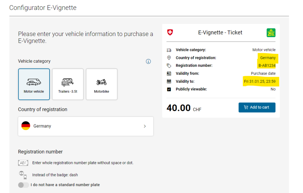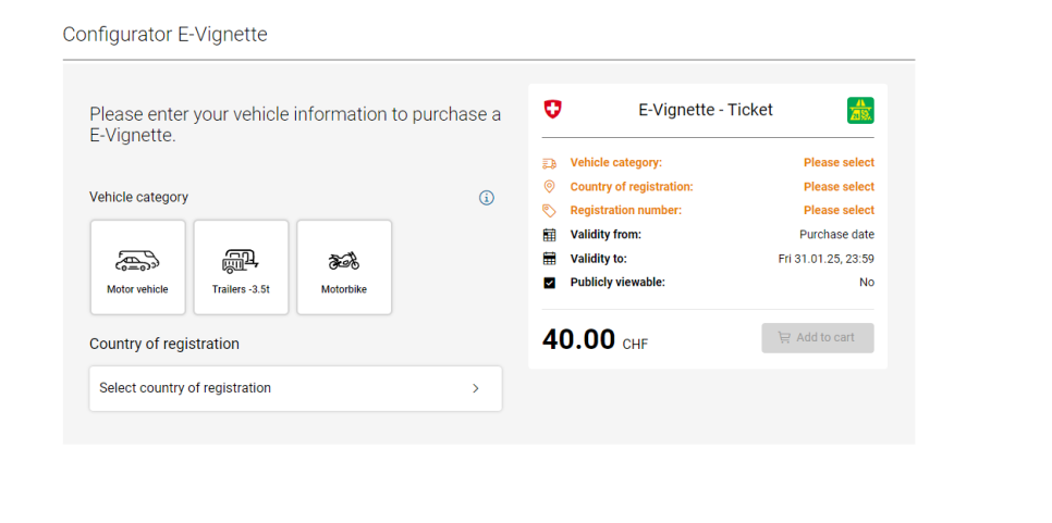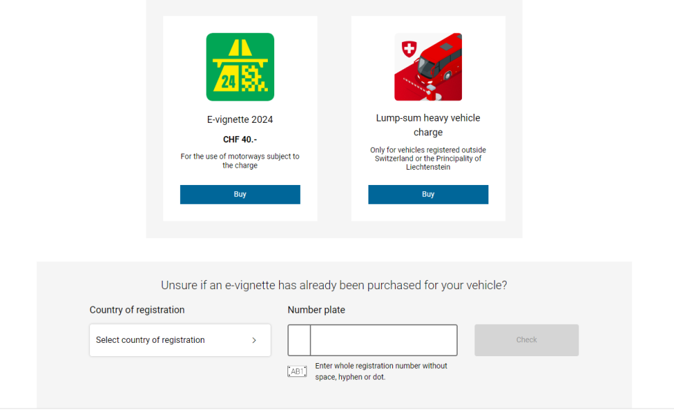 - 구매 및 등록:E-비넷은 스위스 도로 당국의 공식 웹사이트나 지정된 온라인 플랫폼에서 구매할 수 있습니다. 구매 시 차량 번호판 정보를 입력하면, 해당 차량은 자동으로 비넷이 등록됩니다.