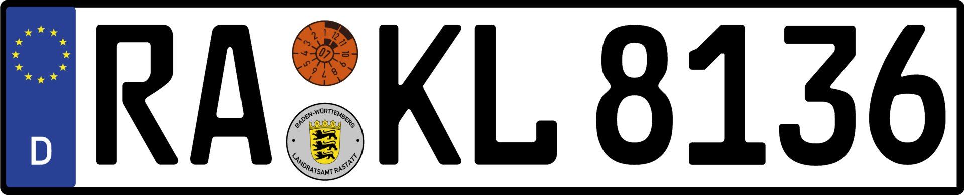 예를 들어 이런 식입니다. 사실 차량 등록증을 살펴보면 정확히 알 수 있지만 보통 이를 잘 확인 안 하시고 번호판만 봐서 헷갈리시는 것 같아요. 예를 든 번호판은 RA-KL8136입니다. 가장 왼쪽의 문자는 차량 등록지역의 코드번호입니다. 예시의 RA는 Rastatt라는 지역의 코드입니다. 그런 뒤 임의의 문자와 숫자로 이루어진 번호로 구성이 됩니다. 지역 코드와 나머지 문자 중간에는 해당 지역 엠블럼과 Tüv 검사 일자가 적힌 스티커로 구분이 됩니다.