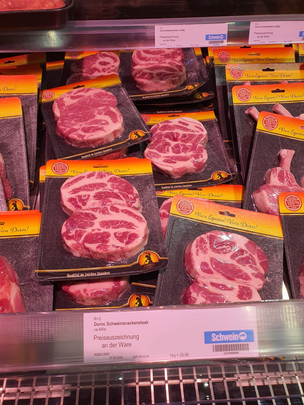 듀록(Duroc) 품종의 돼지고기 목살입니다. 1kg에 30유로일 정도로 소고기만큼 비싸긴 합니다만 그만큼의 품질을 자랑하는 고기이지요. 이베리코보다 듀록 품종의 돼지고기를 더 좋아하시는 분들도 많이 계시지요.