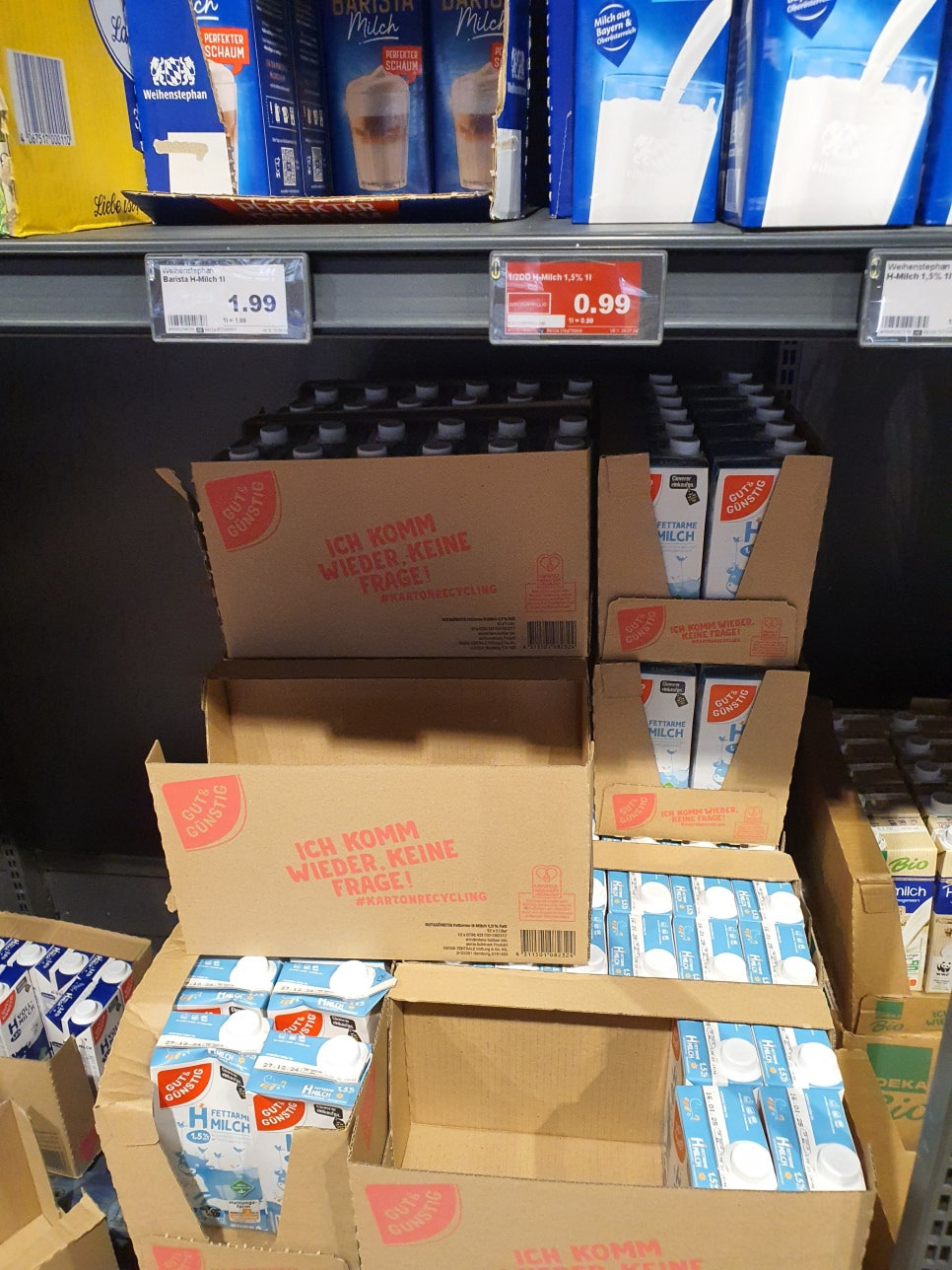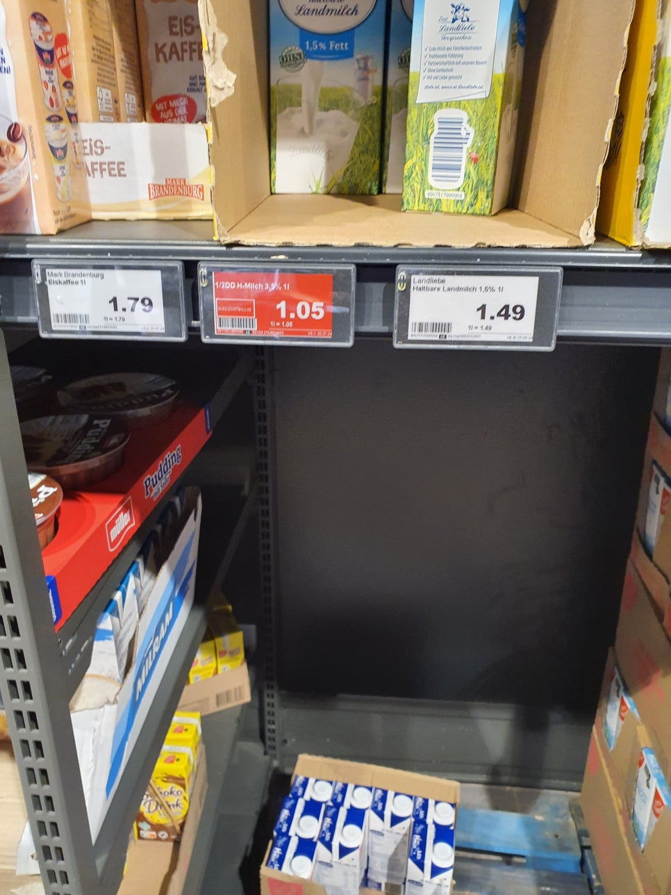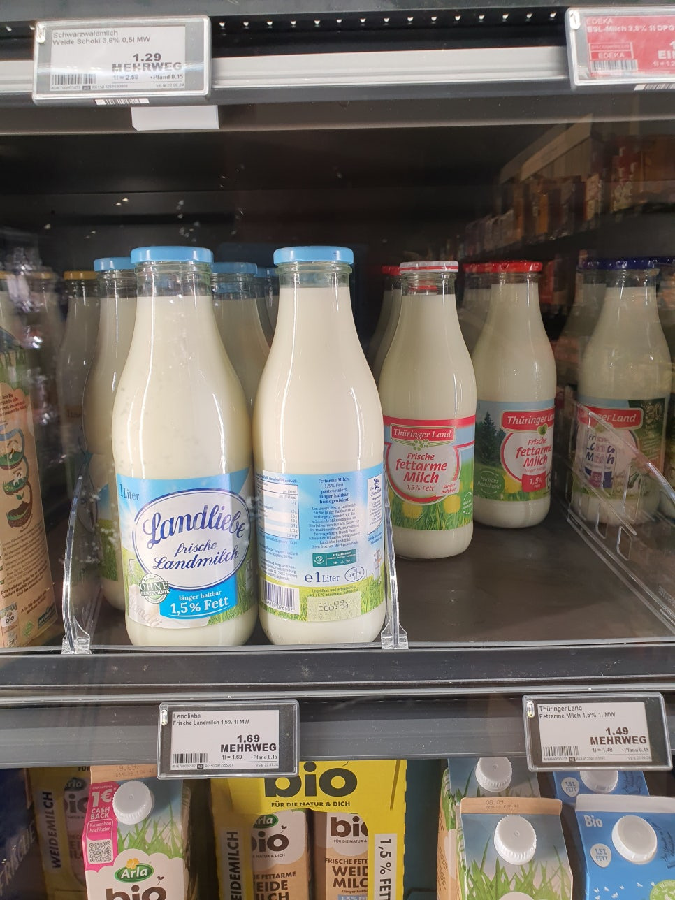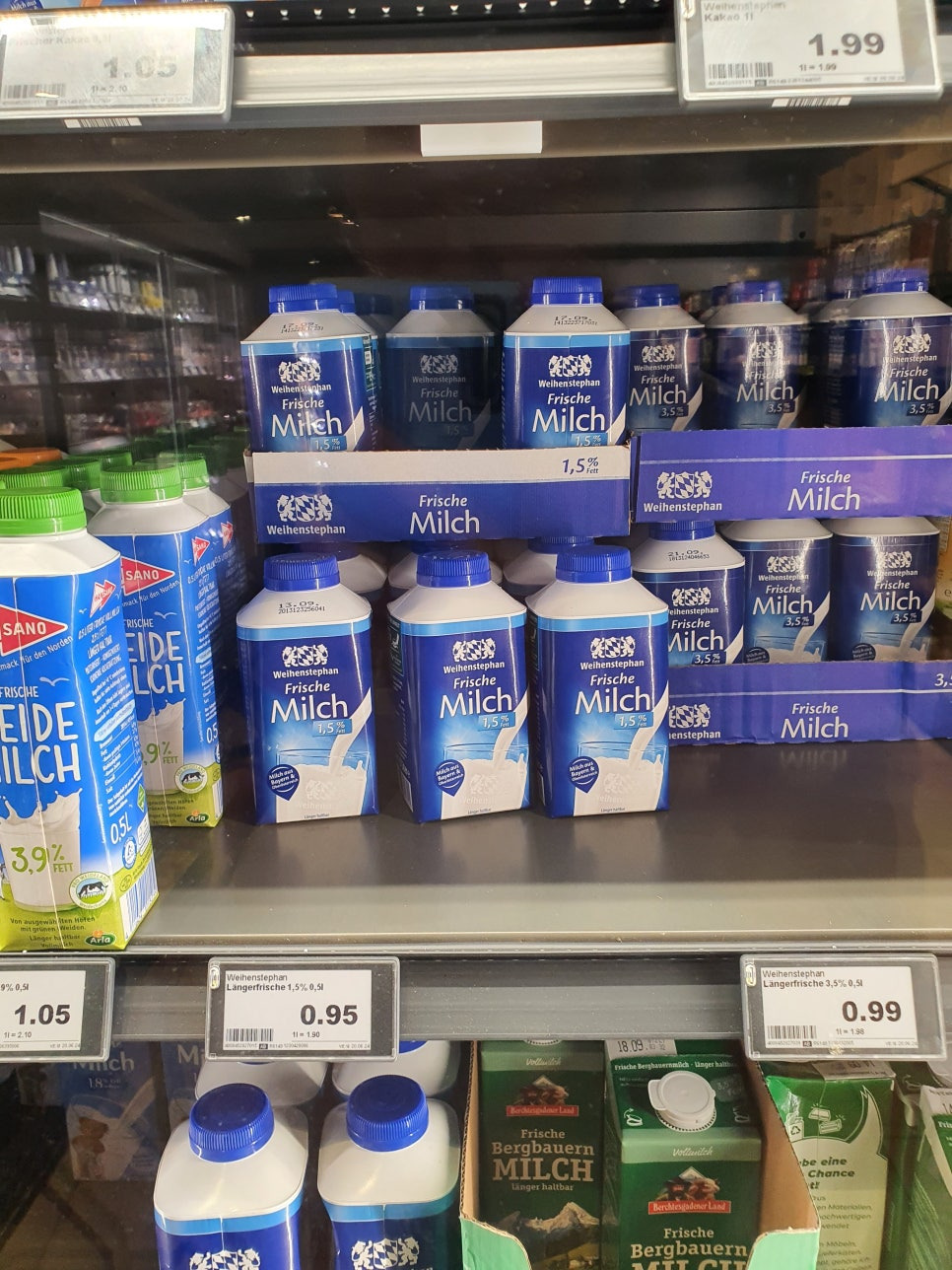 브랜드별로 차이점을 보이긴 하지만 PB상품의 경우 리터당 1.05 유로 입니다. 한국보다는 저렴하지요. 요새 환율이 오르긴 했지만 그래도 브랜드 우유들도 한국보단 저렴합니다.