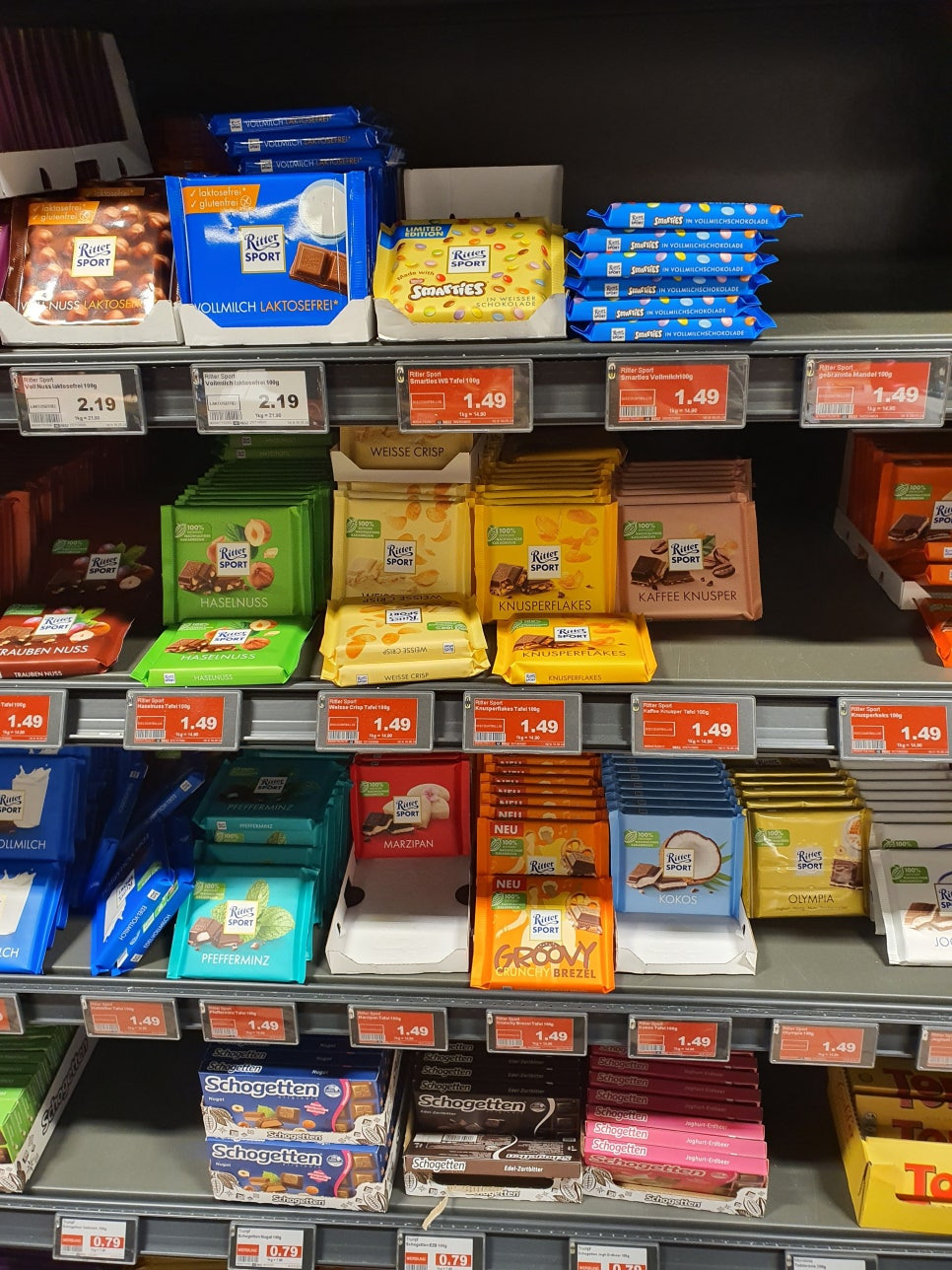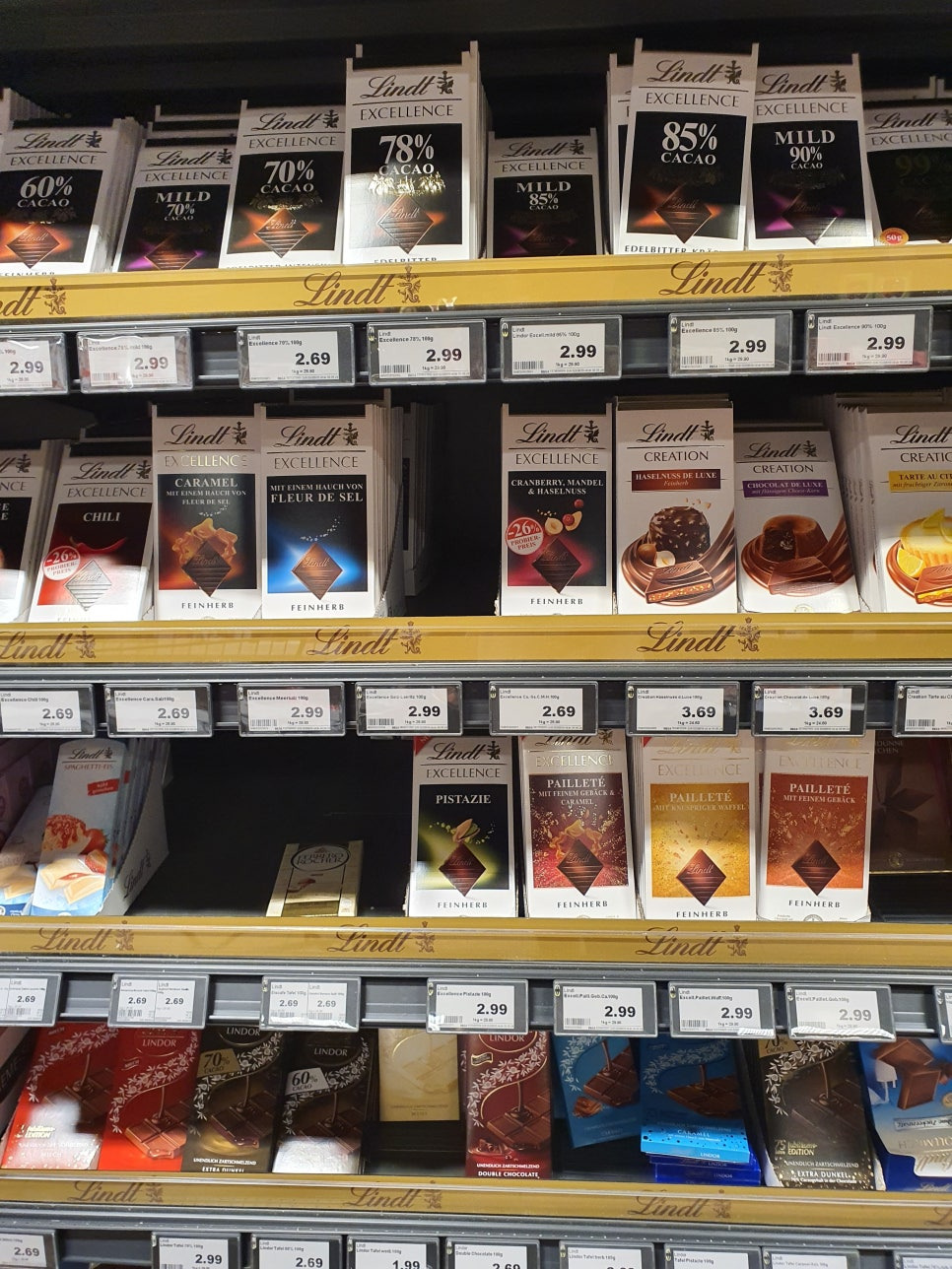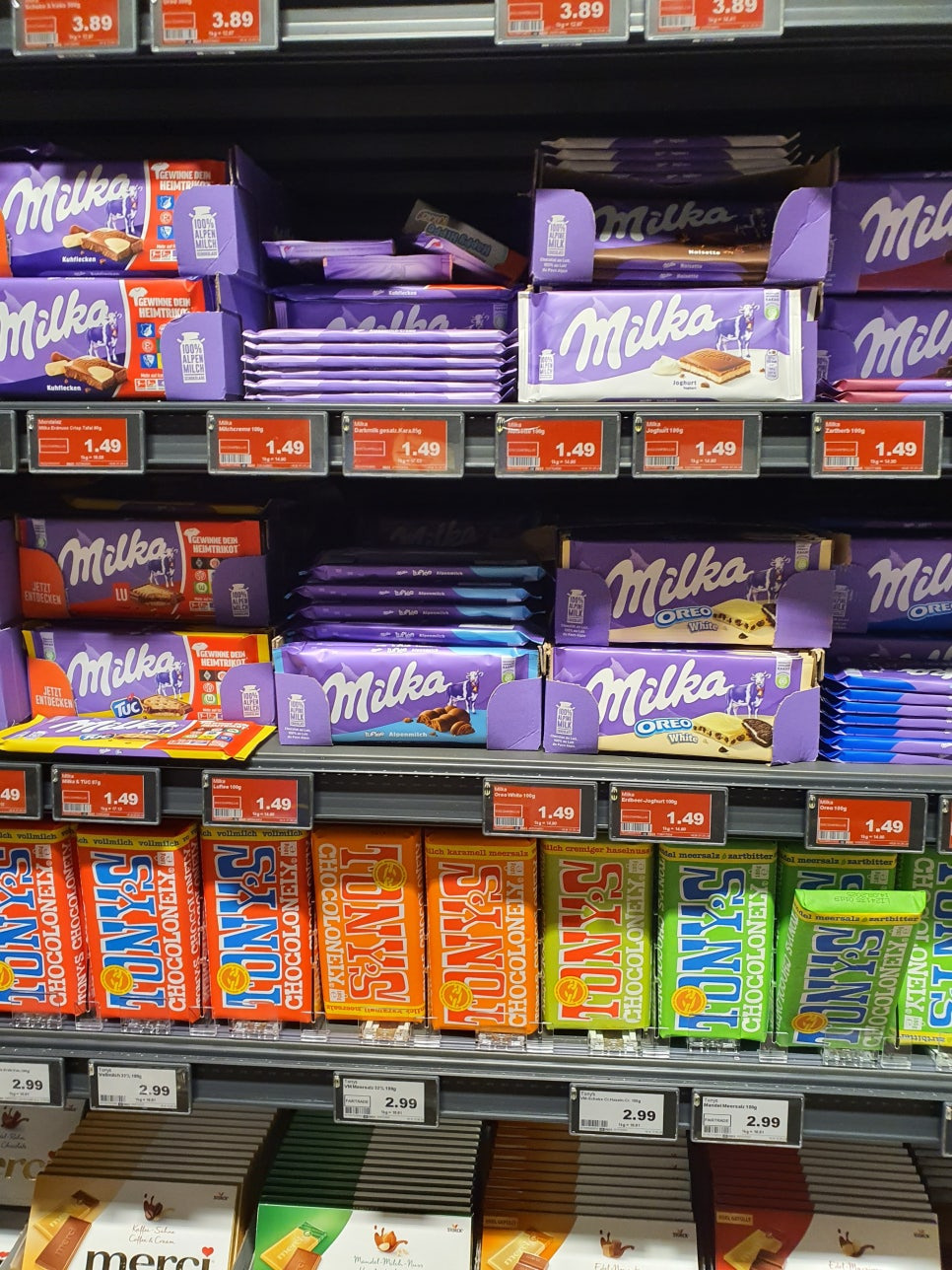 다음은 초콜릿쪽으로 넘어가볼께요. 마트에서 가장 흔히 볼 수 있는 초콜릿 브랜드는 린트(Lindt)와 밀카(Milka)일겁니다. 대중적인 브랜드이므로 딱 기대하시는 수준의 맛을 보여줍니다. 맛있어요!