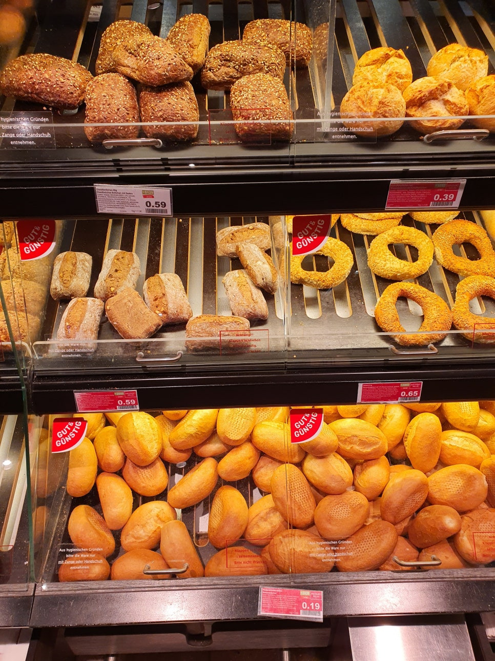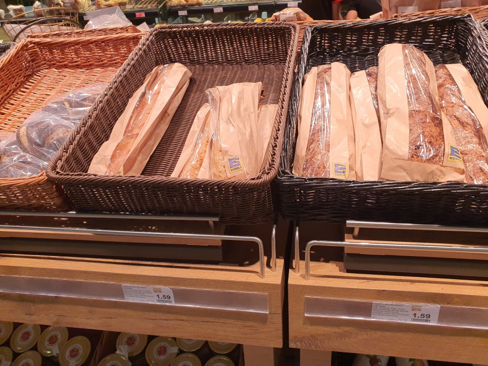 조금 더 안쪽으로 들어가면 빵들이 나오게 됩니다. 이 곳도 카우프란트와 마찬가지로 매장에서 빵을 바로 구으며 판매를 하고 있습니다. 빵과 샐러드들을 활용해서 샌드위치를 쉽게 만들어 드실 수 있고 저렴하게 한끼를 때울 수도 있어요. 다만, 한국 빵들보다 식감이 더 퍽퍽하고 거칠게 느껴지실 겁니다. 한국빵같은 부드러움을 기대하시면 안되요. 부드러운 빵을 고르시려면 샌드위치용 흰 식빵을 고르시는게 좋습니다.