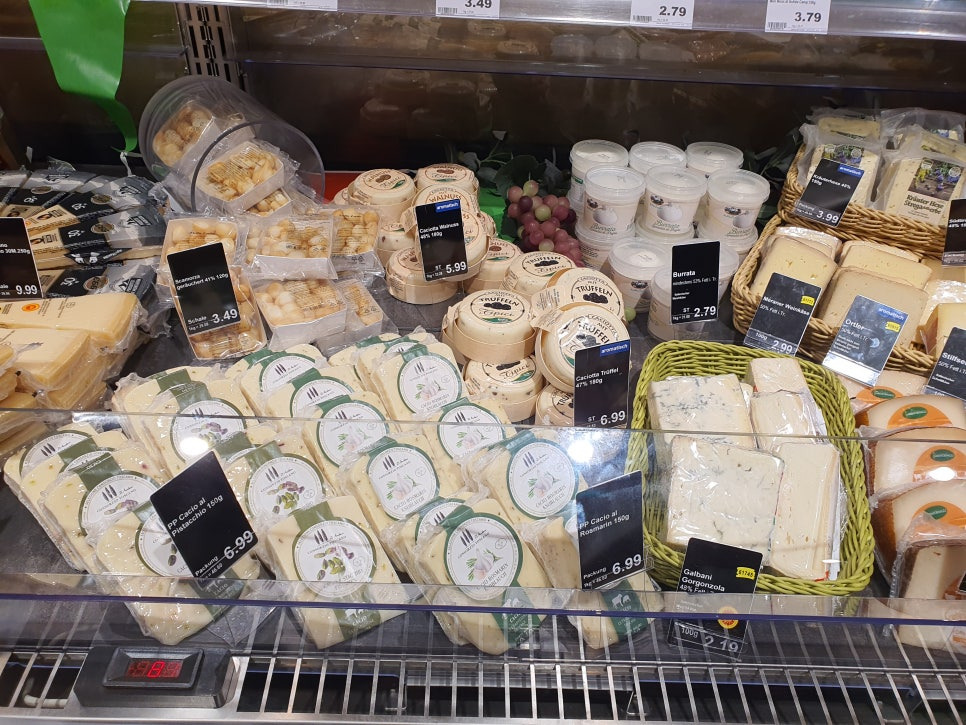 유럽에서 치즈가 빠질 수 없지요. 에데카는 좀 더 좋은 퀄리티의 치즈들이 많은 것 같아요. 사진으론 다 담지 못했지만 정말 다양한 종류의 치즈가 진열되어 있답니다.