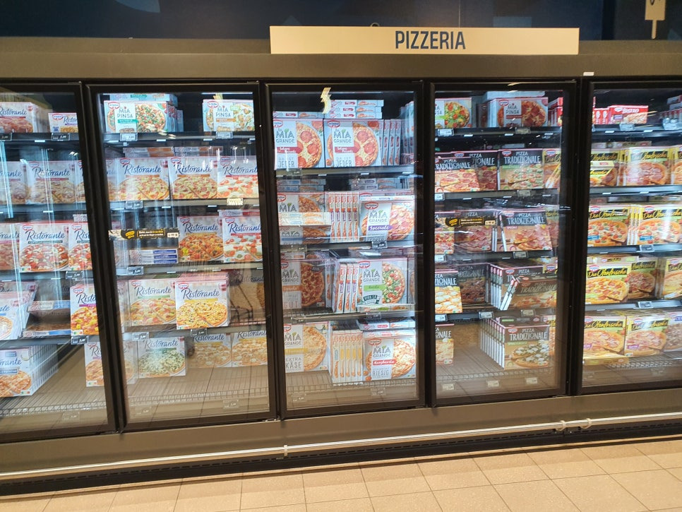 다음으로 보이는건 냉동코너입니다. 그 중에서도 가장 큰 영역을 차지하고 있는건 바로 냉동피자이지요. 다양한 가격대의 피자가 있지만 보통 3유로대의 피자가 가성비가 좋습니다.