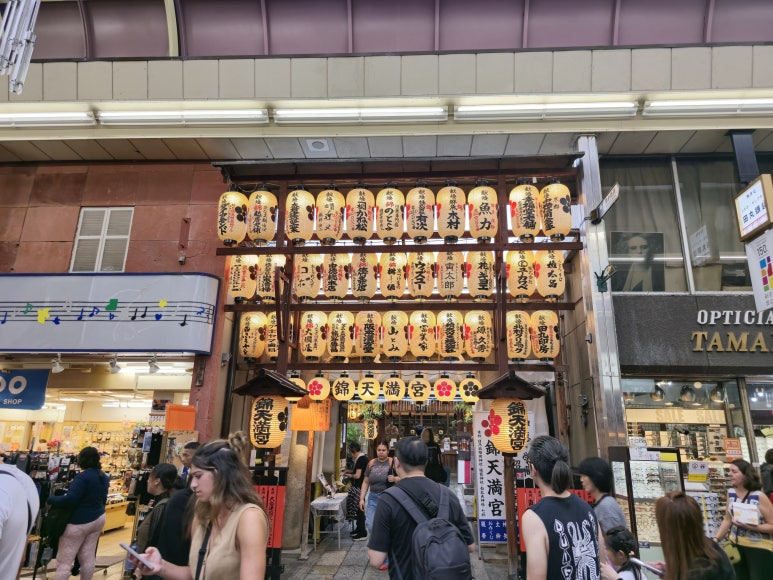 니시키 텐만구의 입구는 시장의 상점들 사이에 있어 독특한 분위기를 자아냅니다. 또한, 이곳에서는 학업 성취와 소원 성취를 기원하는 다양한 부적과 기념품을 구매할 수 있습니다.
