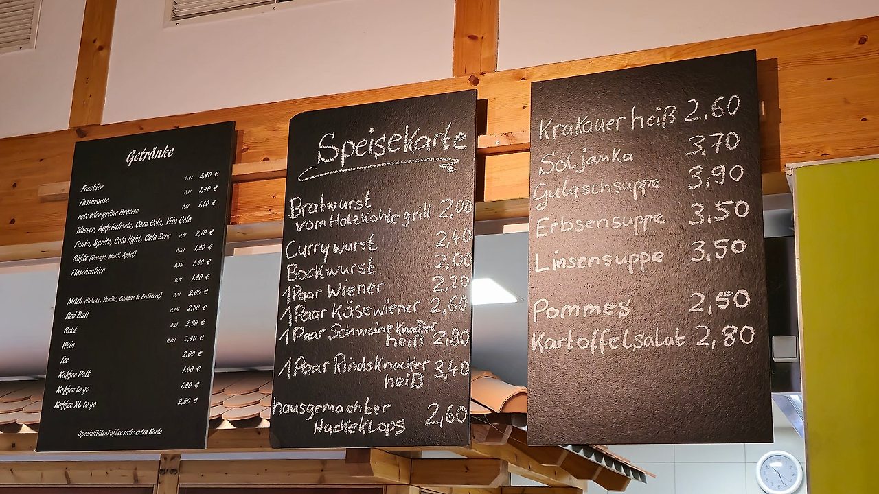 메뉴를 보면 왜 인기가 많은지 알 수 있습니다. 숯불 그릴에 구운 소세지가 하나에 2유로입니다. 정말 믿을 수가 없는 가격이지요. 소세지가 작지도 않습니다.