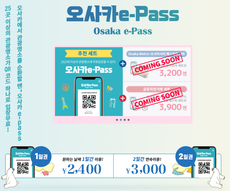 오사카 e-pass는 주유패스와 달리 교통 이용은 포함되지 않지만, 오사카 내 주요 관광지 무료 입장과 각종 할인 혜택을 제공하는 디지털 패스입니다. QR코드를 스마트폰에 저장해 편리하게 이용할 수 있다는 점이 특징입니다.