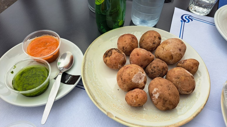 함께 시켰던 오징어 구이도 너무나도 맛있었지요. 그리고 테네리페 어느 식당에 가나 만날 수 있는 파파스 아루가다스(Papas arrugadas)를 모호 소스와 함께 시켰지요. 파파스 아루가다스는 소금물에 삶은 감자예요. 우리 강원도 알감자와 비슷한 맛을 가진 감자예요. 모호 소스와 정말 잘 어울린답니다. 이거에 반해서 집에서도 모호 소스를 직접 만들어 감자와 함께 먹고 있어요. 테네리페에 방문하시면 꼭 모호 소스랑 함께 감자를 시켜서 드셔보세요.