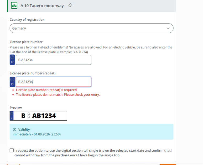 - 통행 구간 선택: 예) A11 Karawanken, A10 Tauern, A13 Brenner 등