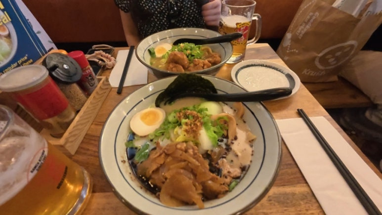 와이프가 주문한 메뉴는 가라아게가 듬뿍 올라간 미소라멘이었습니다. 돈코츠 라멘과 달리 면발이 노란빛을 띠어 보니, 아마도 계란이 들어간 면인 듯했습니다. 면발의 익힘이 절묘해 씹는 맛이 살아 있었고, 부드럽고 구수한 미소국물은 바삭하게 튀겨진 가라아게와 만나 깊은 조화를 이뤘습니다. 한 입 맛을 보니, 담백하면서도 풍부한 맛이 입안 가득 퍼지며 또 다른 매력을 선사하더군요.