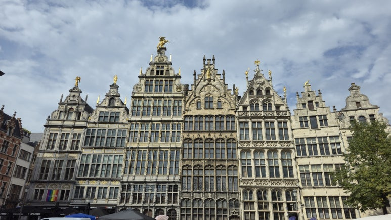 배도 든든하게 채웠으니 다시 관광을 해봐야겠지요. 트램을 타고 시내 중심가로 이동을 했습니다. 시청이 있는 광장에는 유명한 브라보의 동상이 있었어요. 앤트워프 도시의 이름이 유래되었다는 전설의 상징이기도 하지요. 화려한 시청 건물 옆에는 그에 못지 않은 화려한 길드하우스가 있습니다. 이 곳으로 정말 많은 돈이 모여들었었다라는 상징이겠지요.