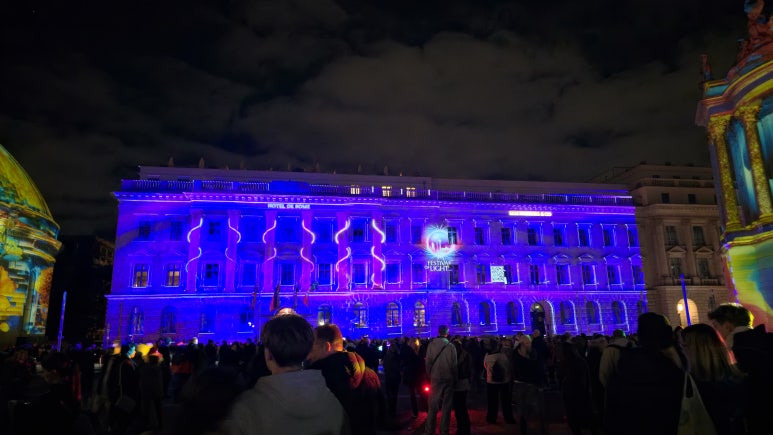 대성당을 뒤로하고 운터덴린덴(Unter den Linden) 거리로 들어서면, 거리 양옆의 나무에도 은은한 조명이 설치되어 산책하기 좋은 조명 산책로가 이어집니다. 그 길 에는 바로 베벨플라츠(Bebelplatz)가 있습니다. 이곳은 Festival of Lights의 상징적인 장소로, 호텔 드 로마(Hotel de Rome), 콘체르트하우스(Konzerthaus), 국립오페라하우스(Oper Unter den Linden) 세 건물이 각각 다른 테마의 라이트쇼를 선보이고 있었습니다. 조명들이 음악과 함께 변화하며 마치 고전 건축물들이 살아 움직이는 듯한 분위기를 연출했어요. 조금더