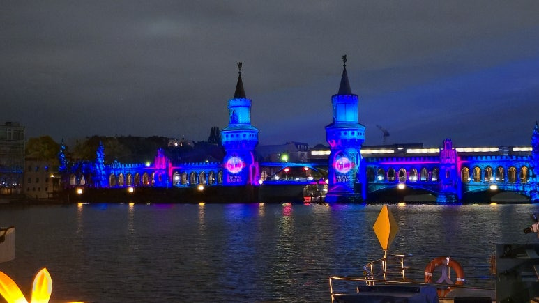 올해 Festival of Lights 2025에서는 기존 중심가 외에도 오버바움 다리(Oberbaumbrücke)가 새롭게 조명되었습니다. 이 다리는 18세기에 처음 만들어져, 당시에는 베를린 시내로 들어가는 주요 관문 역할을 했던 곳이에요. ‘오버바움(Oberbaum)’이라는 이름은 독일어로 ‘위쪽의 나무’라는 뜻을 가지고 있는데, 과거 이곳에 세워졌던 다리가 나무로 만들어진 목조 다리였기 때문에 붙여진 이름이라고 합니다. 지금은 붉은 벽돌과 아치형 탑이 인상적인 고딕 양식의 석조 다리로 재건되어, 베를린을 대표하는 건축물 중 하나로 사랑받고 있습니다.