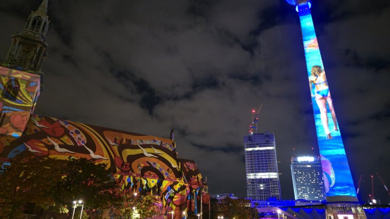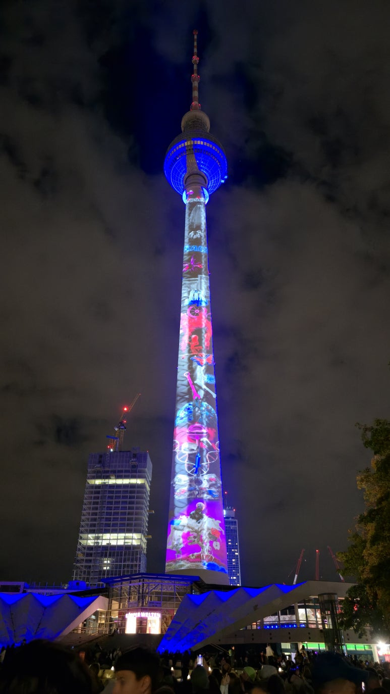 오버바움 다리의 라이트쇼를 감상한 뒤, 저는 알렉산더플라츠(Alexanderplatz)로 이동했습니다. 베를린의 상징인 TV타워(Fernsehturm)가 바로 눈앞에 보이는 이곳은 매년 Festival of Lights의 주요 시작점이에요. TV타워의 거대한 기둥을 스크린으로 변모 시켜 다양한 국적의 아티스트들의 작품을 관람하실 수 있습니다. 독특하고 재미난 아이디어들이 웃음을 자아내게 합니다. 예전보단 조금은 줄어든 작품 수에 아쉬움이 남기는 했었어요.
