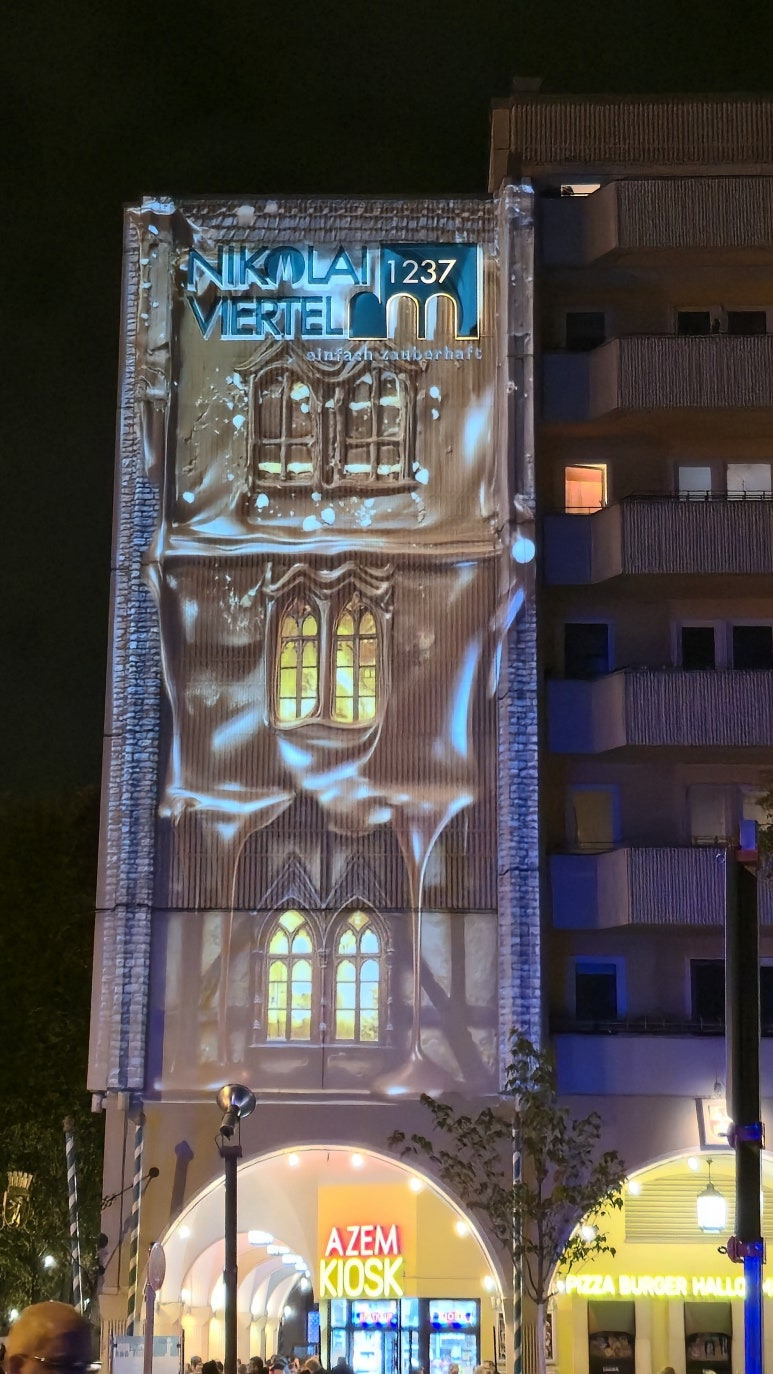 그 옆의 니콜라이 지구(Nikolai Viertel)로 들어서면 분위기가 완전히 달라집니다. 이 곳은 평상시에도 관광객들로 붐비는 곳인데요 좁은 골목길과 전통적인 건물들 사이사이에 설치된 조명 작품들이 아기자기하게 빛나며, 현대적인 알렉산더플라츠의 조명과는 또 다른 ‘고즈넉한 베를린의 밤’을 보여줍니다.