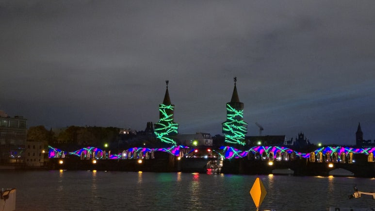 이번엔 기존의 브란덴부르크문이나 베벨플라츠 대신, 오버바움 다리 구간부터 관람을 시작했습니다. 바샤우어 슈트라세(Warschauer Straße) S반 역에서 내려 도보로 약 5분 정도만 걸으면 바로 다리에 도착할 수 있습니다. 알렉산더플라츠(Alexanderplatz) 역에서 S3, S5, S7, S9 노선 중 아무거나 타면 단 세 정거장 거리, 생각보다 훨씬 가까워요. 다리에 가까워질수록 슈프레강 위로 퍼지는 조명들이 반짝이며 반영되어, 물결이 그대로 빛을 품고 있는 듯한 풍경이 펼쳐집니다. 다리의 붉은 벽돌 외벽에 투사되는 라이트 아트는 중세풍 건축물의 질감을 그대로 살려내면서도, 현대적인 색감으로 새 생명을 불어넣은 듯했어요.